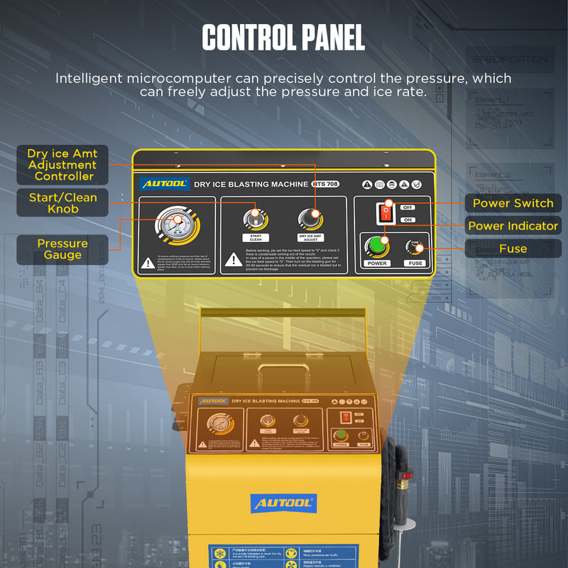 The AUTOOL HTS708 automotive dry ice cleaner is equipped with an intelligent microcomputer for precise pressure control. The device features an adjustable ice feed speed, allowing you to complete cleaning tasks in optimal condition.